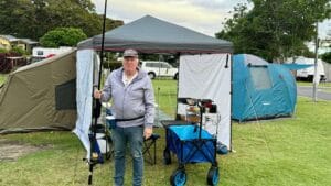 Monday morning after coffee and bacon and sausages and eggs cooked at the campsite Bernie has headed up the boardwalk to do some fishing, because Paul drove around Urunga last night to buy Bernard some 🤬 pilchards to stop him winging because Ray would not do it. Paul and Shaq also headed out along the boardwalk to fish and caught a small flathead of which the size was greatly exaggerated using trick photography. Bernie lost all his pilchards and caught naught.